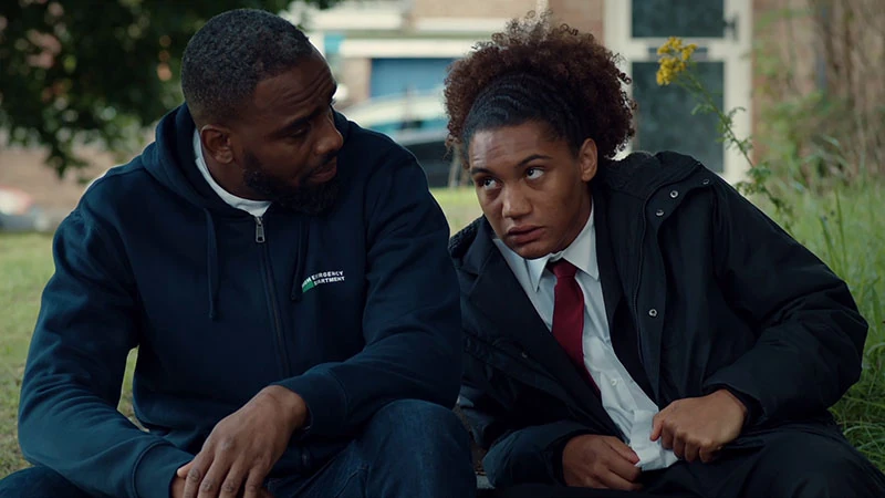 Jacob speaking with Grace about Carmel's injuries outside the ED. (CAS: "Sticks and Stones")